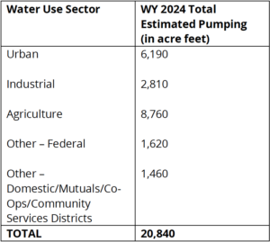 Regardless of whether 7,650 or 14,300 acre-feet per year is used to determine the sustainable yield, extreme overdrafting of the basin is continuing as the estimated pumping reported by all key stakeholders in 2024 is 20,840 acre-fee per year. The overdraft is 13,190 acre-feet per year using the GSP model or 6,540 using an unverifiable model from the largest water pumpers in the basin. The table below breaks down water use by sector.